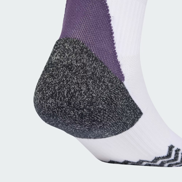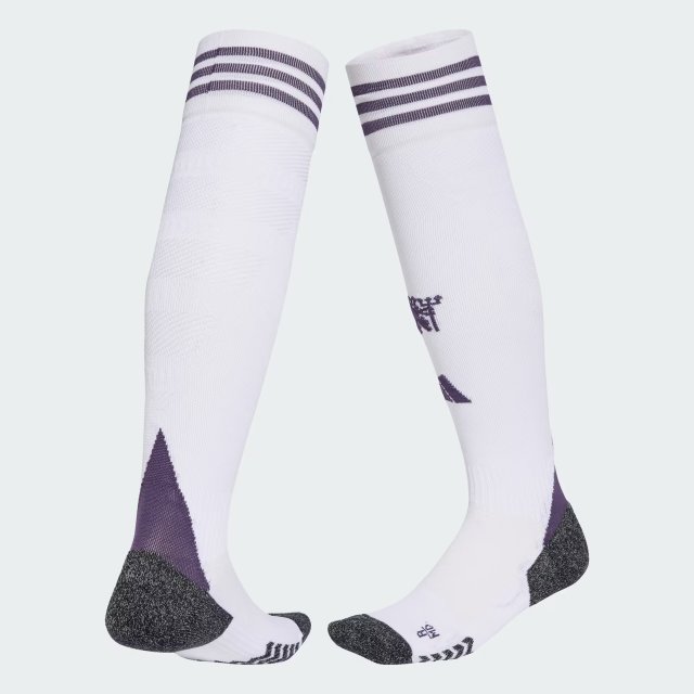 Manchester Uniteds ikoniska bortastrumpor för 25/26. Dessa fotbollsstrumpor har djävulsmärket och lila kant, inspirerade av klubbens djärva bortatröja. Stödjande, stretchigt tyg håller dig bekväm när du rör på dig. Fukthanterande AEROREADY ser till att dina fötter håller sig torra under matchdagen.